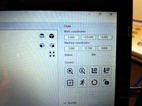 CNCに電源とUSBをつないで動かしてみます。前後に動かしてみると370mm可動範囲があります。ワークエリアのリニアベアリングが枠に当たって止まるので、そのリニアベアリングの端から端が100mm、シャフトを取り付けた支えが暑さ15mmなので30mm、合計130mmあるから、500-130=370mmの可動範囲になりました。370mmあれば、なんとか400mmの板をひっくり返さずに1発で削れるので、これで良しとします。