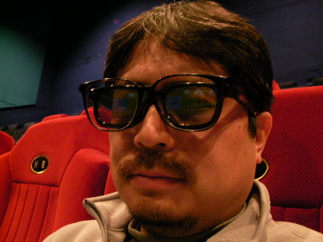 混雑を嫌って、500円増しのプレミアムシートを選んだんですが、その赤いシートにはわれわれも含めて2組しかいませんでした。さーて、この3Dメガネをどうするか。なぜって、私は目が悪いので眼鏡をかけているから。この3D眼鏡をどう掛けるかが問題なんです。偏向眼鏡なので特別な取り扱いはないんですが、まずは、普段の眼鏡の上に、さらに3D眼鏡を掛けてみました。こんな感じです。これでも見えるのですが、私の眼鏡は特別大きいので、ちょっと視野が狭くなります。