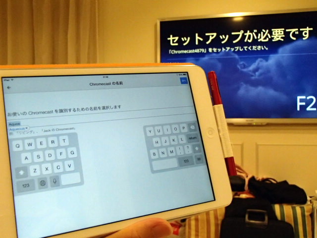 あと、Chromecastから接続するさきのアクセスポイントに情報を入れる。つまり、設定しているときは、iPad miniからChromecastアクセスポイントを通して設定し、運用するときには、Chromecastがアクセスポイントに接続してインターネットやPCと繋がる仕組みらしいです。