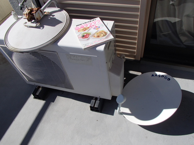 屋根とベランダを何回も往復しなくて済むよう、考えられる工具を袋に詰めて登ります。古いBSアンテナのケーブルを外して調整器に取り付けてみたところメーターの照明が点灯。ってことは、ケーブルの断線の可能性もなくなりました。もう1本のケーブルで調整器とアンテナを結んでアンテナの固定をゆるめて向きを変えてみてもレベルメーターがぜんぜん変化しない。ということは向きが狂ったという可能性もなくなって、アンテナの受信部が壊れたとしか思えません。ので、まずは取り外して降りてきました。